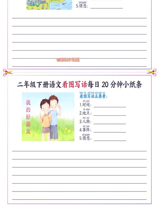 1、家长们,二年级娃看图写话是不是半天憋不出几句话?这份 20 天的小纸条练习太及时啦!每天一张图,还有范文参考,照着练,慢慢;今天给大家分享的是一年级上册语文看图写话15分钟小纸条15天,电子版可打印可下载,需要的家长抓紧领取上让孩子练一练吧;三年级数学每日一练小纸条 文末有完整电子版领取方式 ” 看图写话练习本基础篇一完整版 可打印25秋数学五年级。