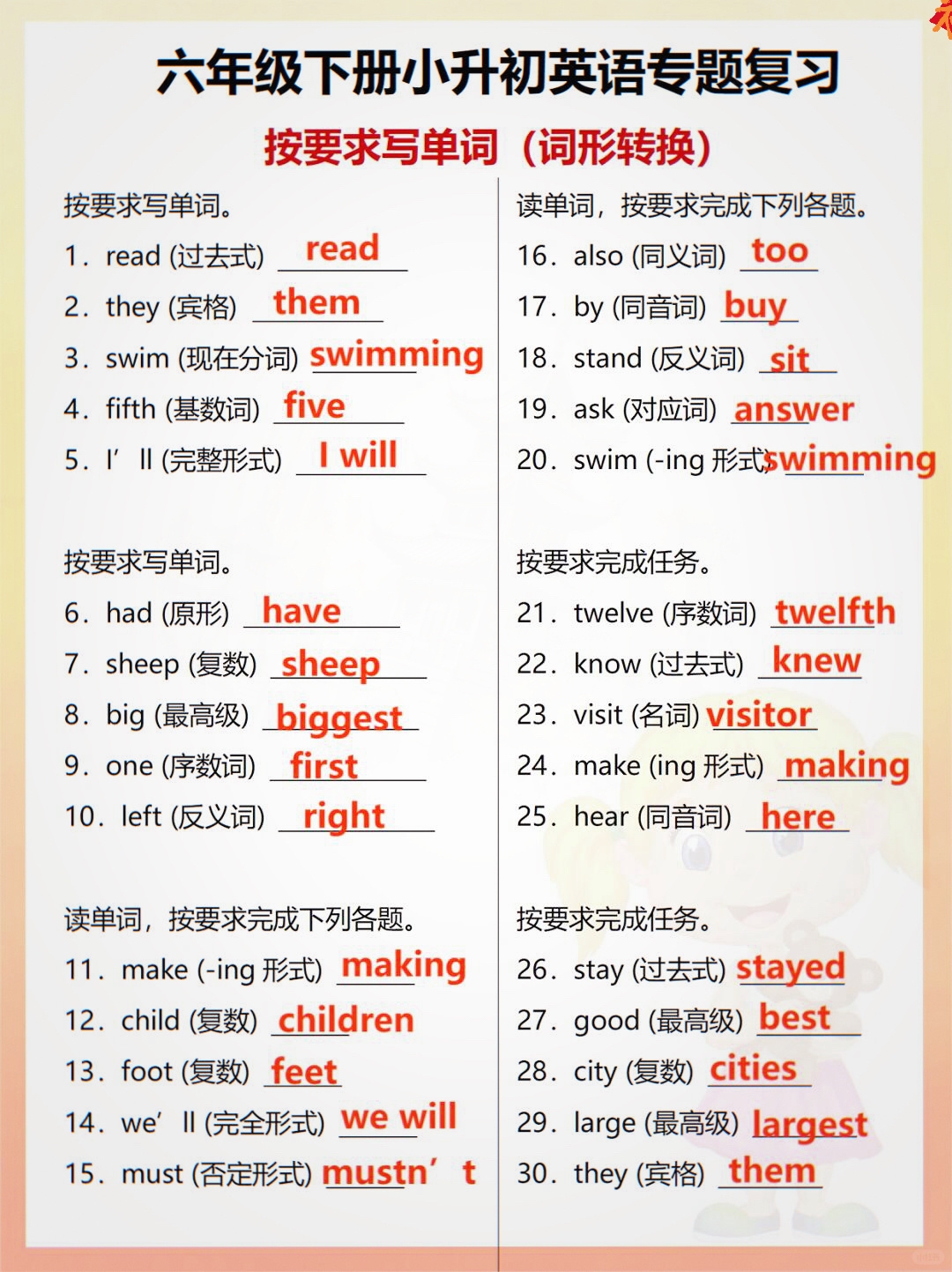 对于即将小升初的孩子来说,英语学科的知识点琐碎且关键,不少家长和孩子在备考时常常感觉抓不住重点今天,我们就来系统梳理;字数三四五 这个技巧说白了就是学习写短句学了一段时间写作的孩子容易在作文中写长句,而长句写不好就变成病句一秒钟的事写三百字 还是针对作文写不长的一种技巧训练用三百字来描写1秒钟内发生的事写想不出现“想” 遇到描写心理活动时,这样的句子已经被孩子们写滥“我脑子里跳出两个小人。