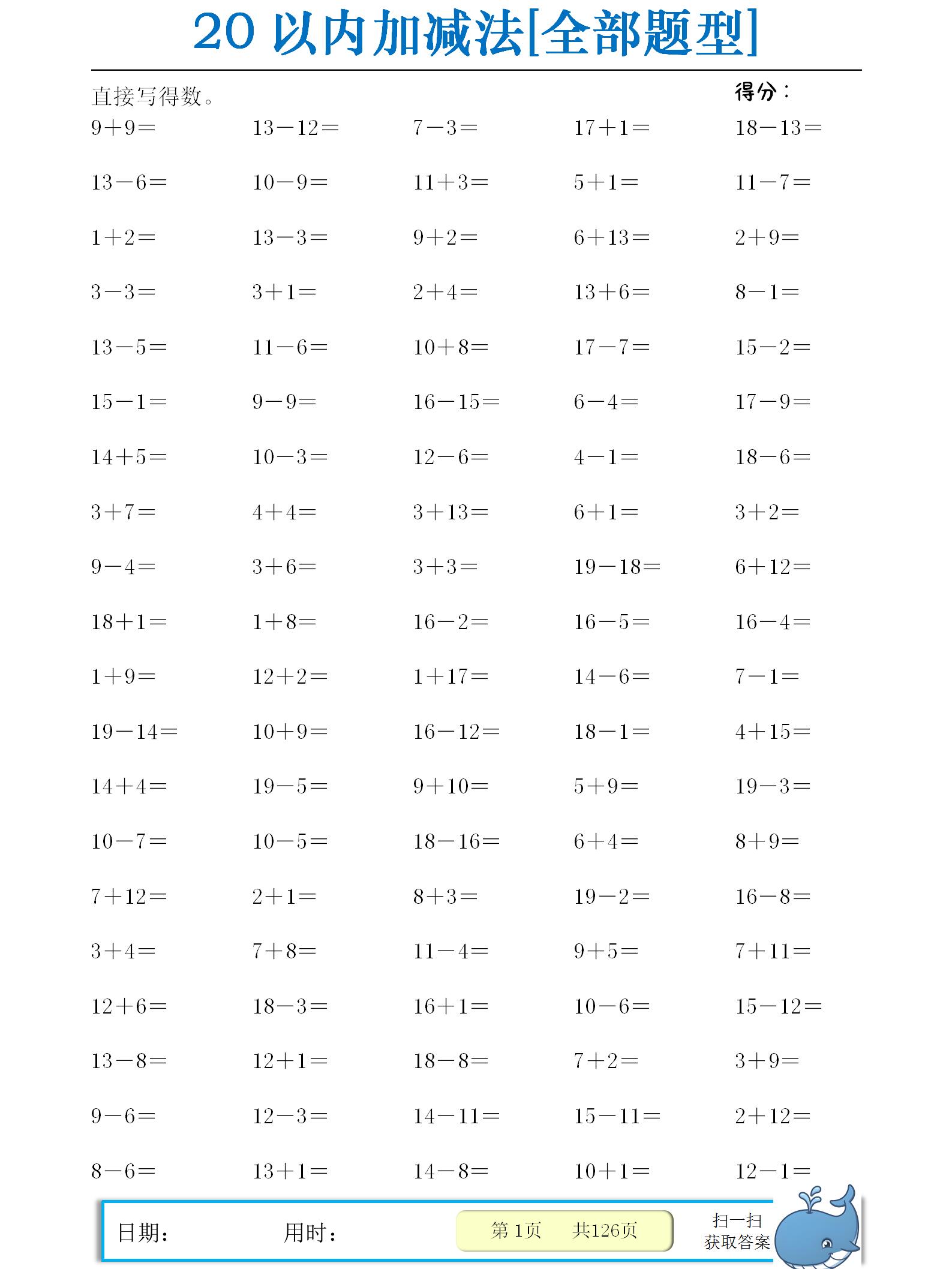 下面着重记录和分析一下幼小衔接数学学习内容,以及遇到的障碍 2学习内容20以内加减法练习10道题7+8= 15+5= 20。