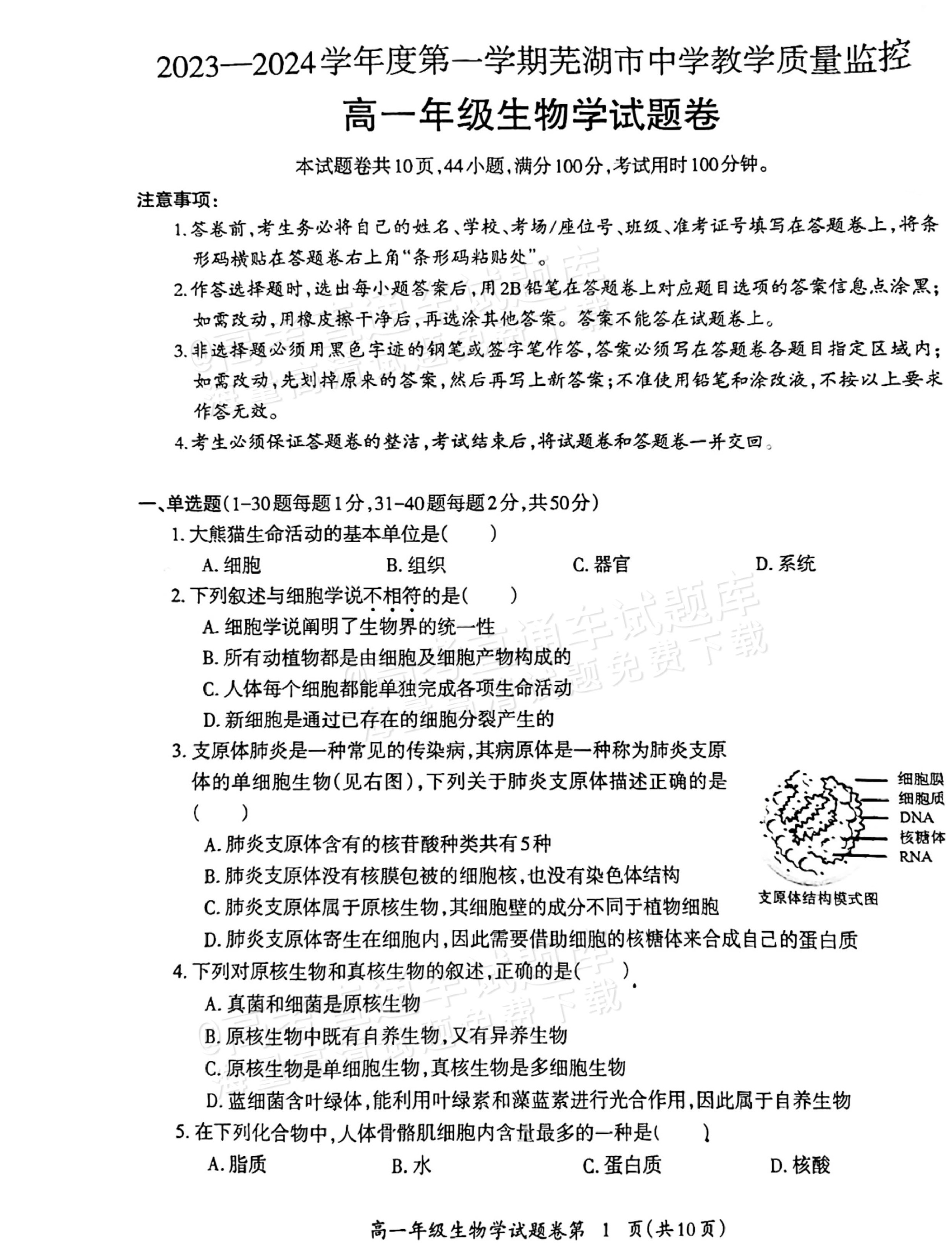 20232024学年上学期期末模拟考试 高一生物考试时间90分钟 试卷满分100分高一生物注意事项1答卷前,考生务必将自。