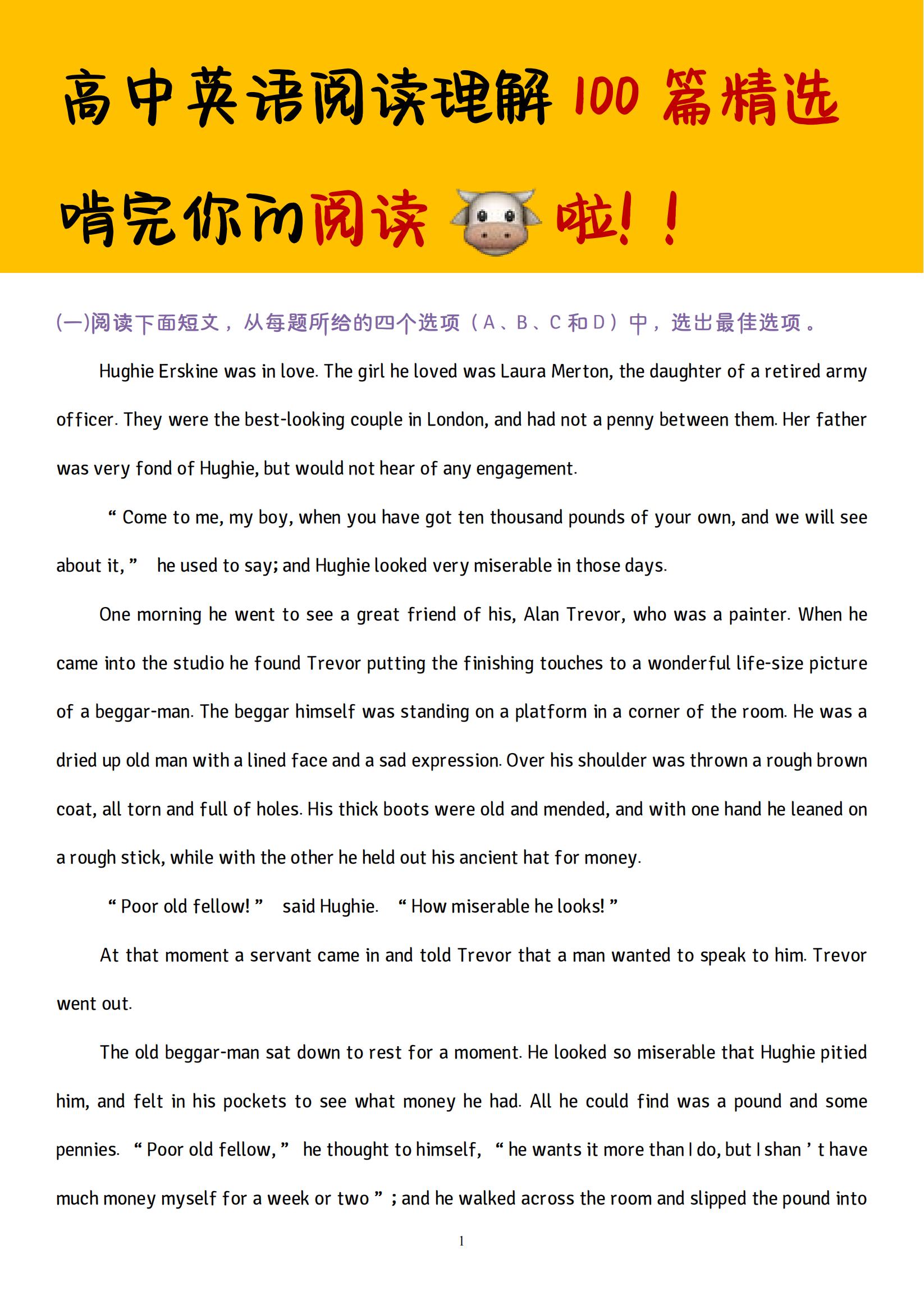 新课标高一英语阅读理解精选10篇附答案导语高一是高中英语打基础的一年,要时常做练习做积累下面是小编为大家精选整理的十篇适合高一学生练习的英。