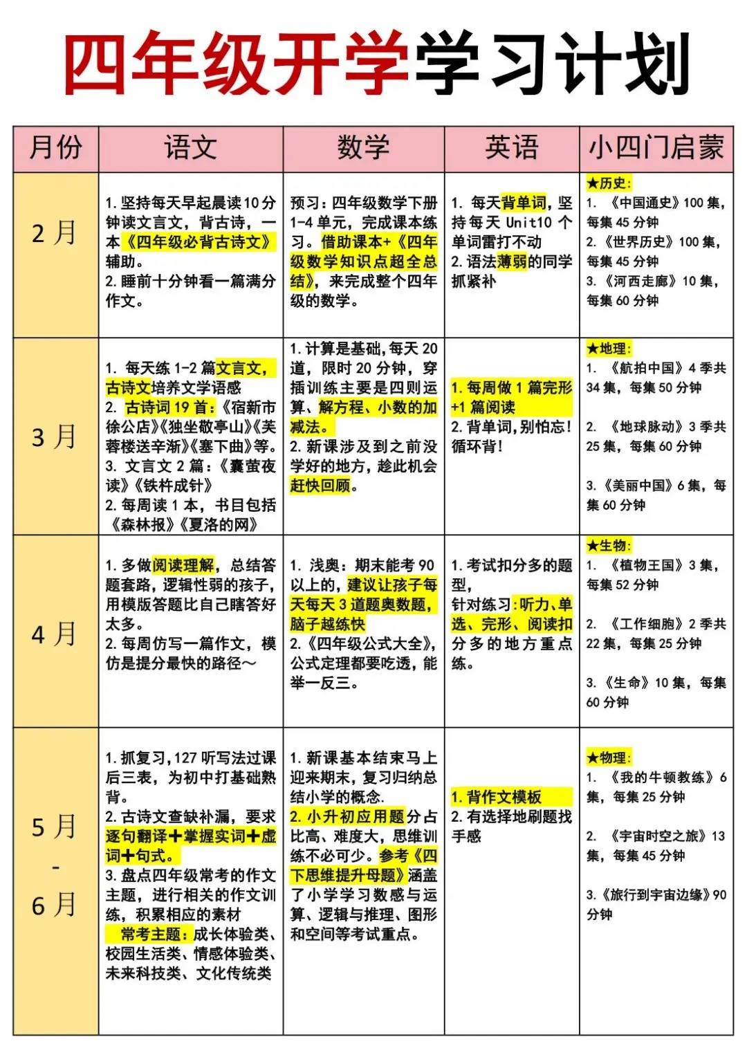 2、每日计划表细化每日学习生活安排,确保时间高效利用 新学 三四年级语文重点从“拼音”“字词”向“文章理解”过渡。